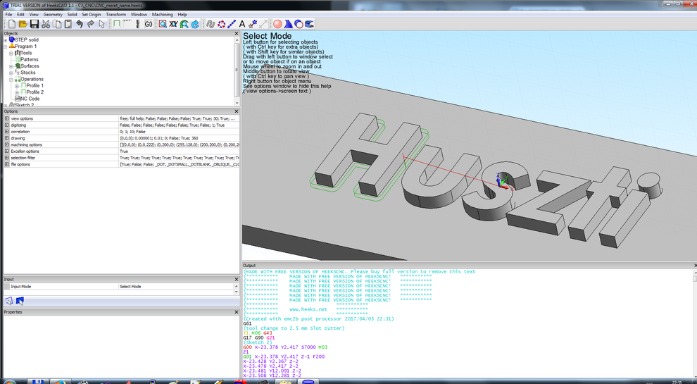 A screenshooton levő formát szerném kimarni. Próbaképpen HeeksCAD-el csináltam a screenshotot. A H betű köré generáltam egy pályát, ezt rendesen meg is csinálta a program. Hasonló módon ha pályát generáltatnék a többi betű köré - amint a betű nem szögletes, tehát görbék vannak benne - elhasal a program, lefagy, majd percek múltán közli hogy nincs elég memória és végleg eltávozik.