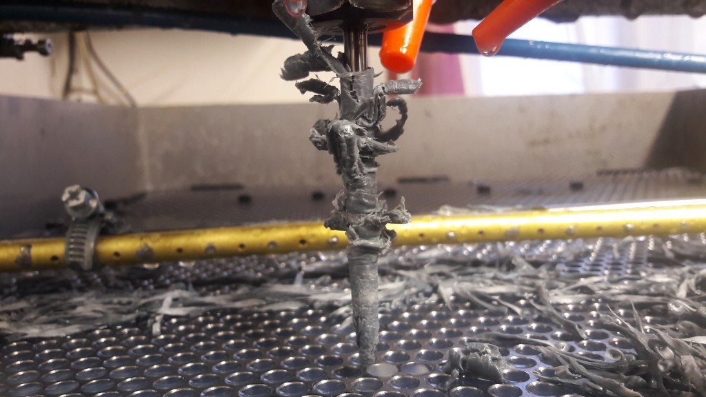 szia, szerintem ugyan az a szitu mint plexi marásnál, sok lehet a fordulat és nagy az előtolás, melegszik a szerszám és ráragad a forgács, óvatosan fogd meg a fúrószárat hogy melegszik-e akkor amikor ráragad a forgács