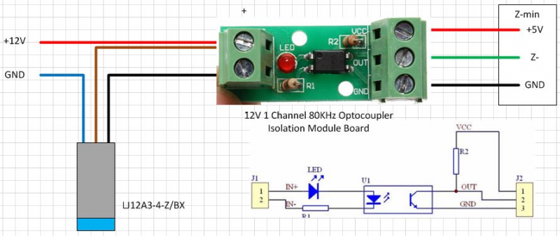 Sem a kártyának, sem a szenzornak nem túl bőbeszédű a leírása, de az kiderül, hogy a kártya 5V-ot kér a bemeneteire, a szenzor pedig 12-36V-ig működik, tehát illeszteni kell a szintet.