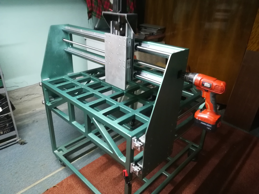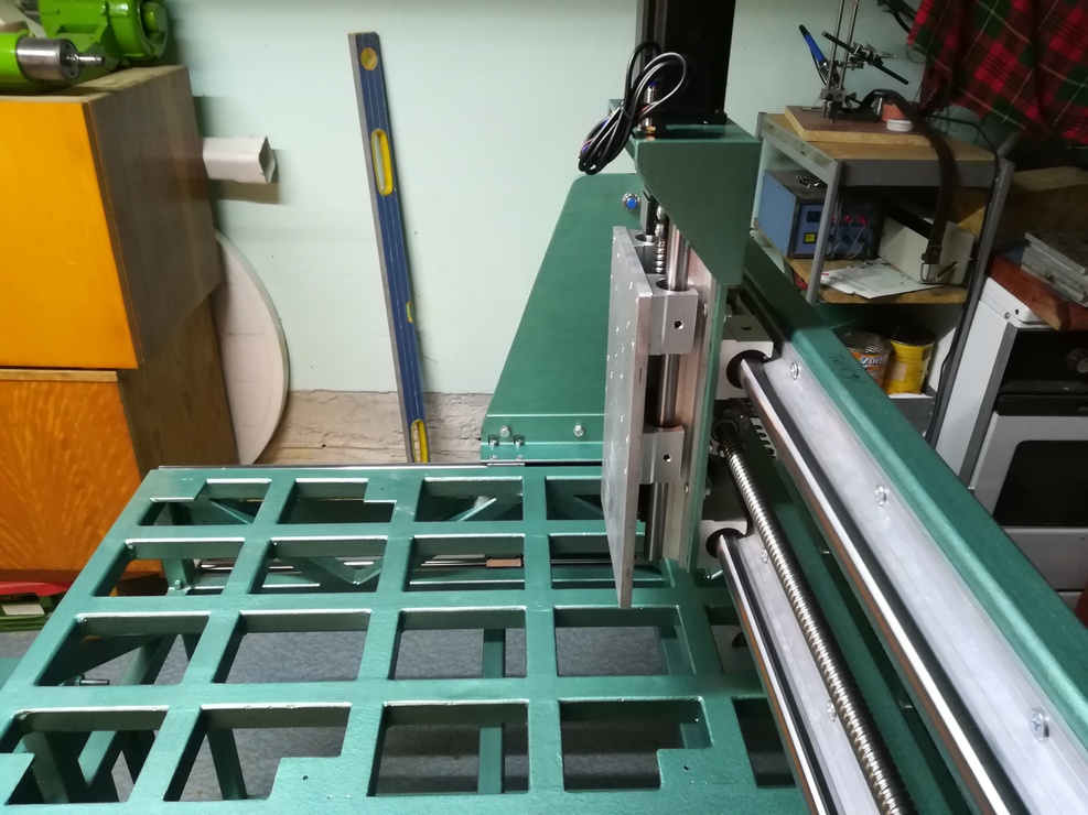 Egy kicsit elgondolkodtam az utolsó mondatodon. Lehet hogy kihagyom a két orsó egy motor szijhajtással kombinált verziót. Egyszerübbnek tűnik ha csak egy orsót használok középen. Még merevitenem kell az alsó összekötő idomot amihez a golyósanya lesz rögzitve. Időközben kicsit haladtam a munkával .Kicseréltem a hibásan tervezett sima 20-as tengelyt, talpastengelyre. A Z és az X tengely végleg elkészült, még az oldfalfalat kell valahogy merevitenem mivel ez csak 6-os kazánlemezből készült. Összeségében massziv ,rezgésmentesnek tűnik az egész, ez köszönhető főleg a beletöltött kvarchomoknak is. De mivel nincsen összehasonlitási alapom csak tippelem hogy stabil. Marás közben fog kiderülni hogy mi az igazság.