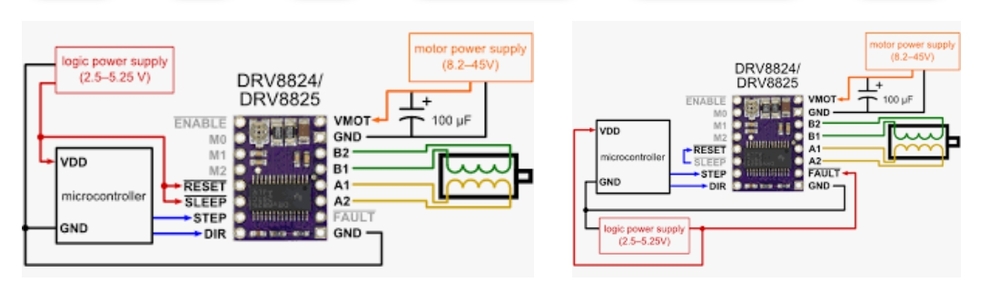 Nem értem miért van a jelgenerátoron két feszültség bemenet (15-160V és 5-12V). A neten kétféle huzalozás is van a 8825-höz, nem tudom nekem melyik lenne a jó, de az Enable pl. egyiknél sincs bekötve. Valaki skiccelje már le mit mivel kössek össze, hogy ne szálljon fel a füst! (azt azért sejtem, hogy a jelgenerátor PUL lába megy a driver Step lábához, a Dir a Dir-hez és a négy motorvezeték is beazonosítható. De honnét kapja a driver a tápot? A motor tápcsatlakozóról? Mert a kétféle bekötés úgy tűnik, hogy csak magas logikai szintre húzza fel vagy a Fault vagy a Reset és Sleep bemenetet. Előbbi esetben a Reset és a Fault össze van kötve? A kék nyíl ezt sugallja... Bocsi hogy ennyire láma vagyok hozzá... [#szomoru1]