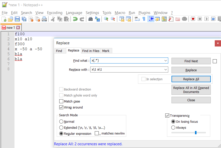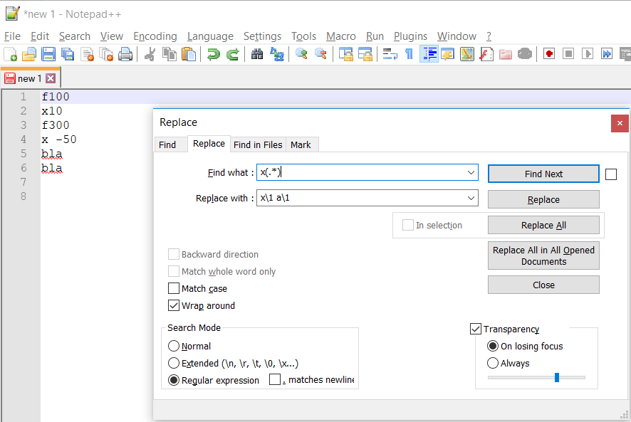 -- wrap around és Regular expression legyen kiválasztva, különben nem fog működni, lásd ismét a képeket