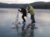 A V azért kell, mert különben oldalra csúszik a egész. A szél oldalról nyomja. Mint a normál vitorlásokon a swert. Annyira csúszik oldalra, hogy még ólmot is fel kell pakolni a korik fölé. Jó szélben 400g/kori volt a jó. Az első szánkóval én is elértem a kb. 50 km/órát, de az egy 1,7m hosszú test. Most kisebbet építünk a modellező sporikkal, hogy egyforma legyen, és versenyképes. A képen látszik a különbség.