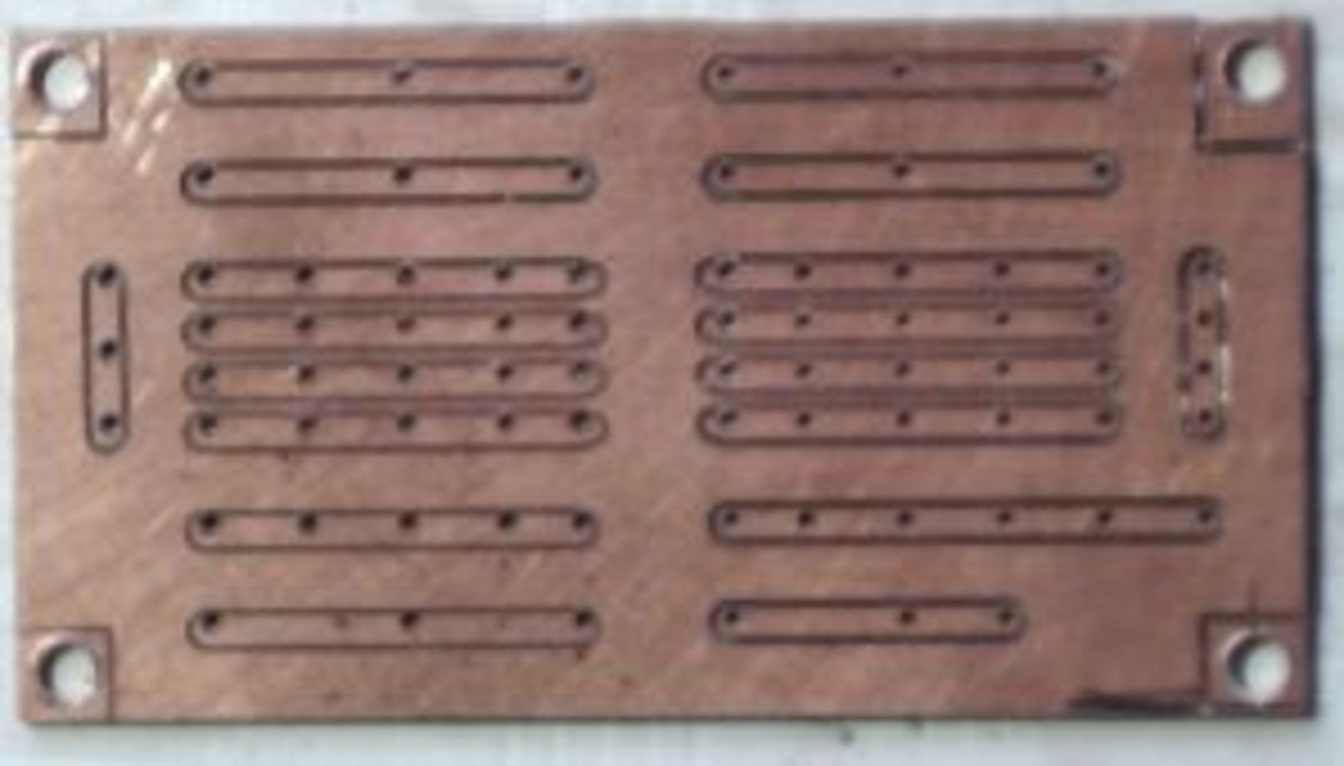 Korábban kértem tanácsot mit tegyek, a karcoldámat gyakran használom PCB (nyák= csak nem szeretem ezt a szót, nálam mást jelent) gravírozására. A baj: eltolódott a furat és a vezetősáv. A fúratok jó helyen vannak, a sávokról már nem lehet ezt elmondani. Mindenféle igazgatás után ez lett a legjobb eredmény, ezzel már meg tudom csinálni a próba-panelt, de látható nem az igazi.