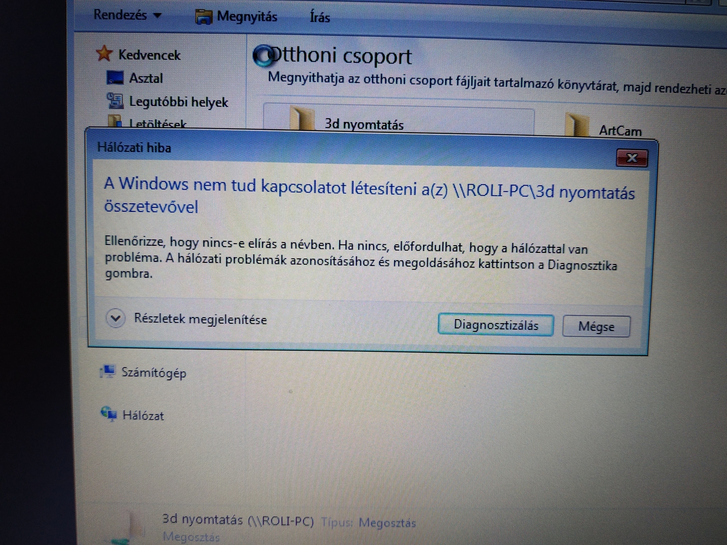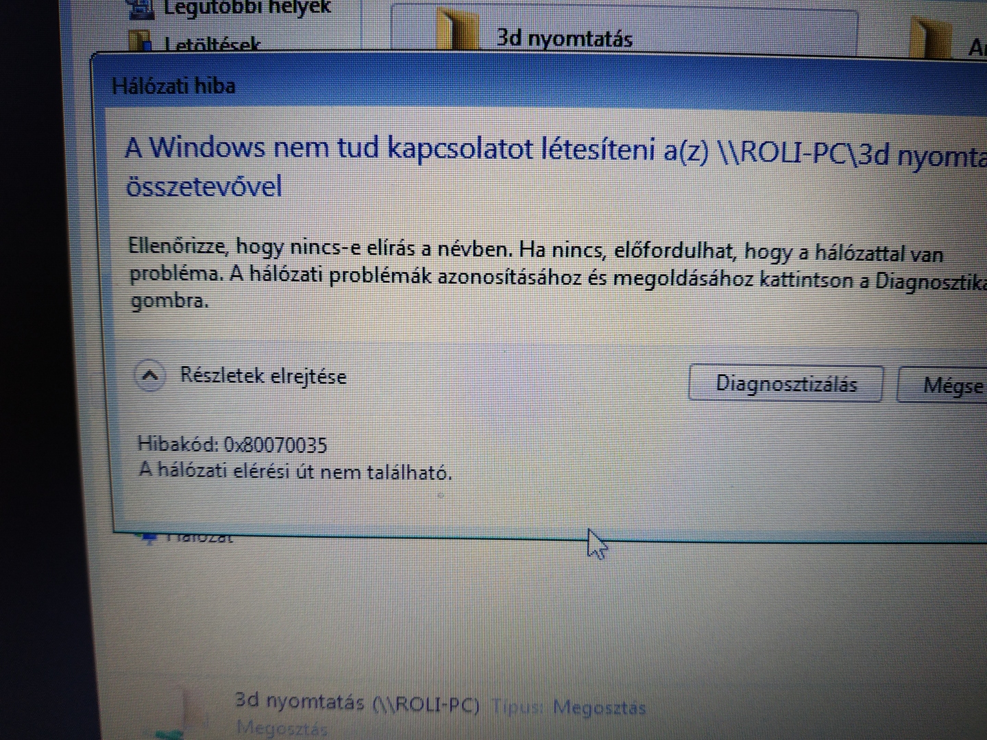 Laptopról szeretném elérni a PC-n lévő mappát. Otthoni hálózatban megosztottam. Valami gond van, mert a képeken lévő hibát kapom. Win7 van mindkettőn. Mi lehet a probléma? Köszönöm.