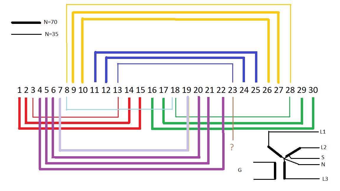 A sárga tekercseknek valószínűleg rosszul van rajzolva a tekercsfeje , akkor egyfázisúnak még elmehetne , ez a kötés , négy tekercs az lehetne egy fázis .
