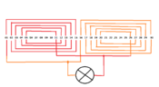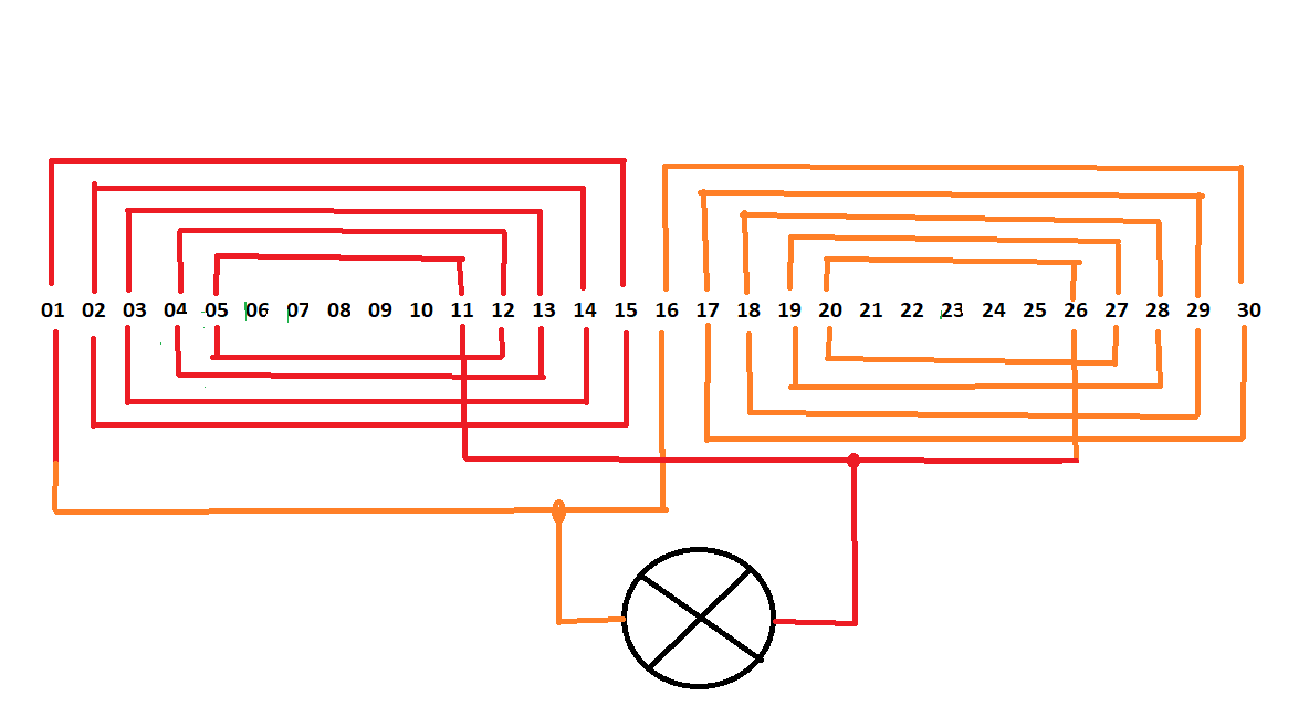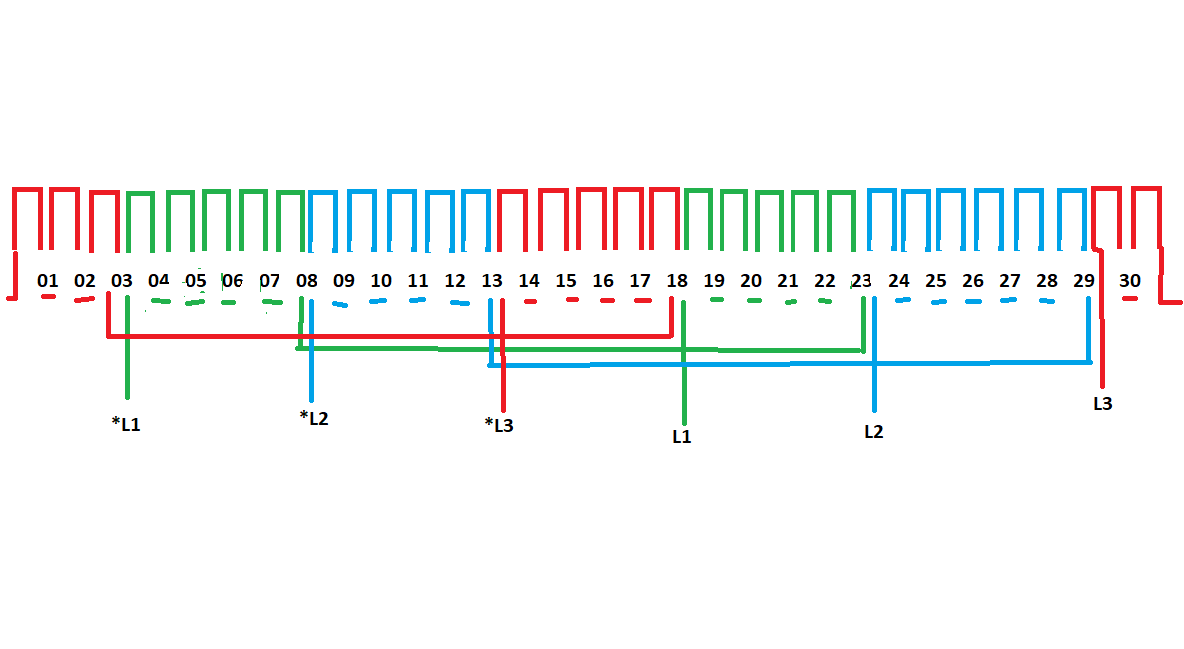 Persze készítettem egy egyszerű sablont meg befűztem a szálakat csak rosszul fogalmaztam, mivel vastag a huzal így nehezen lehet igazítani, illetve venni kell hozzá 4kg huzalt plusz szigetelés, a tanulói munkadíjammal is vagy 40ezer forint amiért egy ilyen aggregátort használtan már majdnem lehet kapni, igaz ugyanígy alu tekerccsel, de nem is ez a fő gond hanem az impregnálás hiánya miatt is kidörzsölődik a szigetelés, a közös hornyokban sem volt plusz szigetelés. Viszont lenne egy ötletem, hogy sablonnal készítek vékony többeres huzalból tekercselést és ezt fűzöm be a hornyokba, tehát minden szomszédos horonyba megy egy tekercs, ezeket az ábra szerint kötöm (csalóka mert egy menettel rajzoltam), szerintem ezzel ugyanazt kapom mint a másik fajta tekercseléssel csak kb harmad annyi huzal (kisebb belső ellenállás) felhasználásával. Egyébként a bldc motorok is hasonló tekercselésűek.