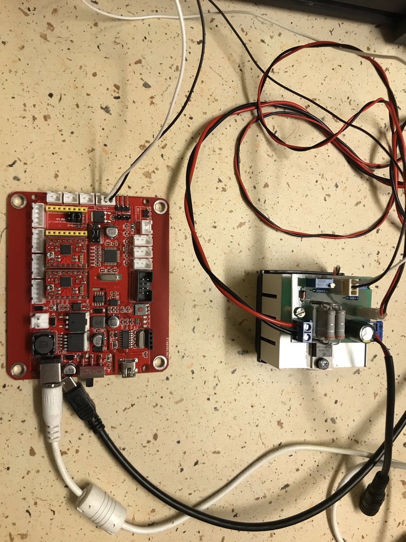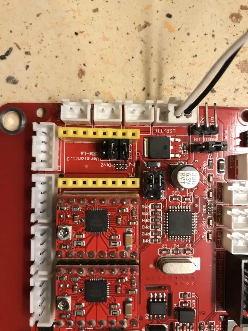 Mivel az én lézerem 3 pines volt, mert közvetlenül a controlboardról kapott áramot meg vezérlést is onnan oldotta meg, Heboé viszont 2 pines, mert csak a vezérlést intézi a controlboard, ezért a 3 pines csati "GND" és "PWM" jelölésű pinjeire dugtam csak rá a lézer vezérlőjéről érkező kábelt.