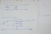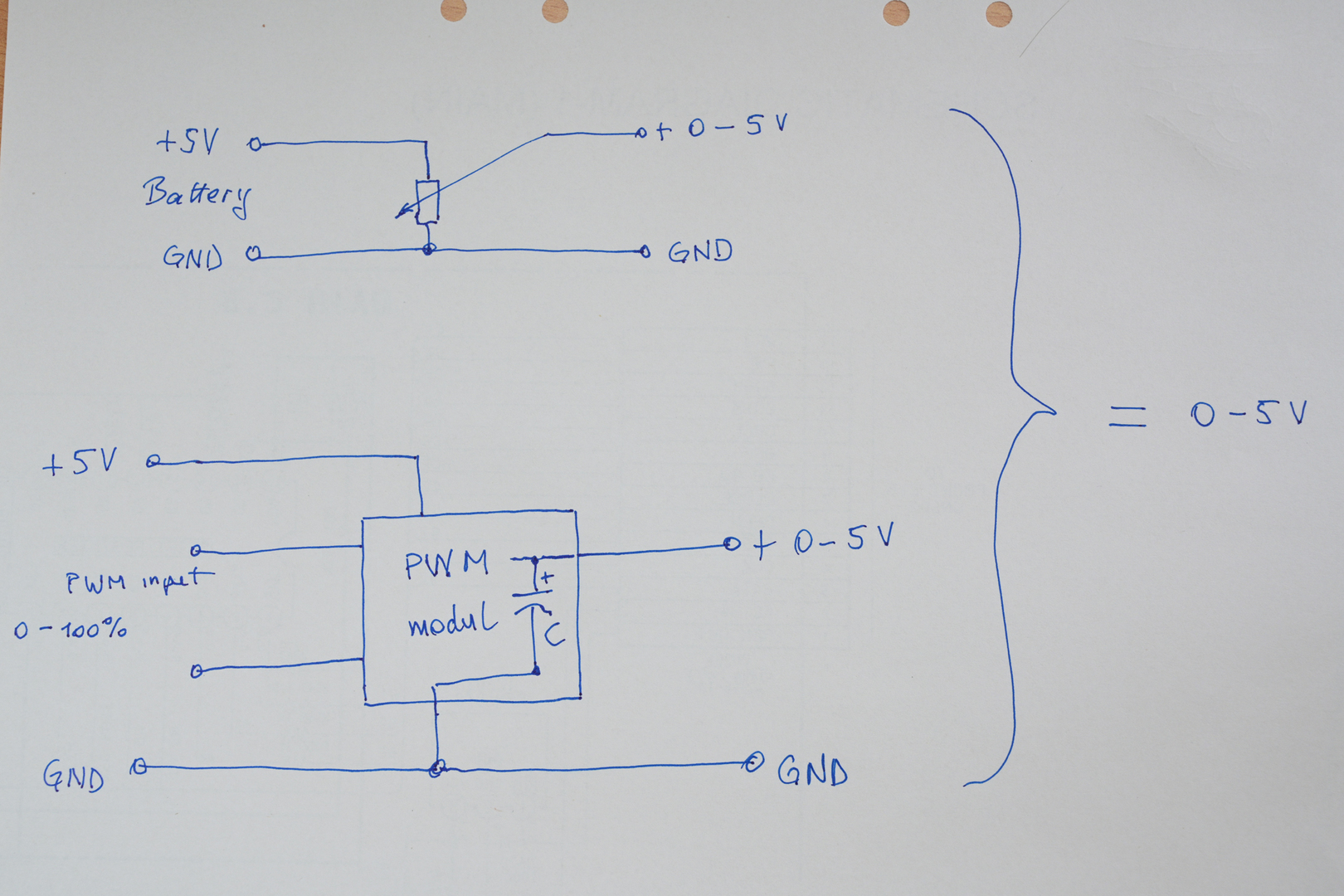 PWM = Pulse Wide Modulation (impulzus szélesség moduláció) és az azt jelenti hogy 0-100% impulzus át van alakítva 0-5V-ra, a 5V bemenet van modulálva pulzusokkal. Úgyhogy ha például 50% a bemeneti pulzus akkor 2,5V a kimeneti feszültség a lenti példa szerint. Az ugyan az mintha a fenti példás akkumulátoros "igazi" analóg körben a potenciométer középen van. Mind a két példának ugyanaz a kimeneti eredménye ha a PWM modul jól van tervezve.