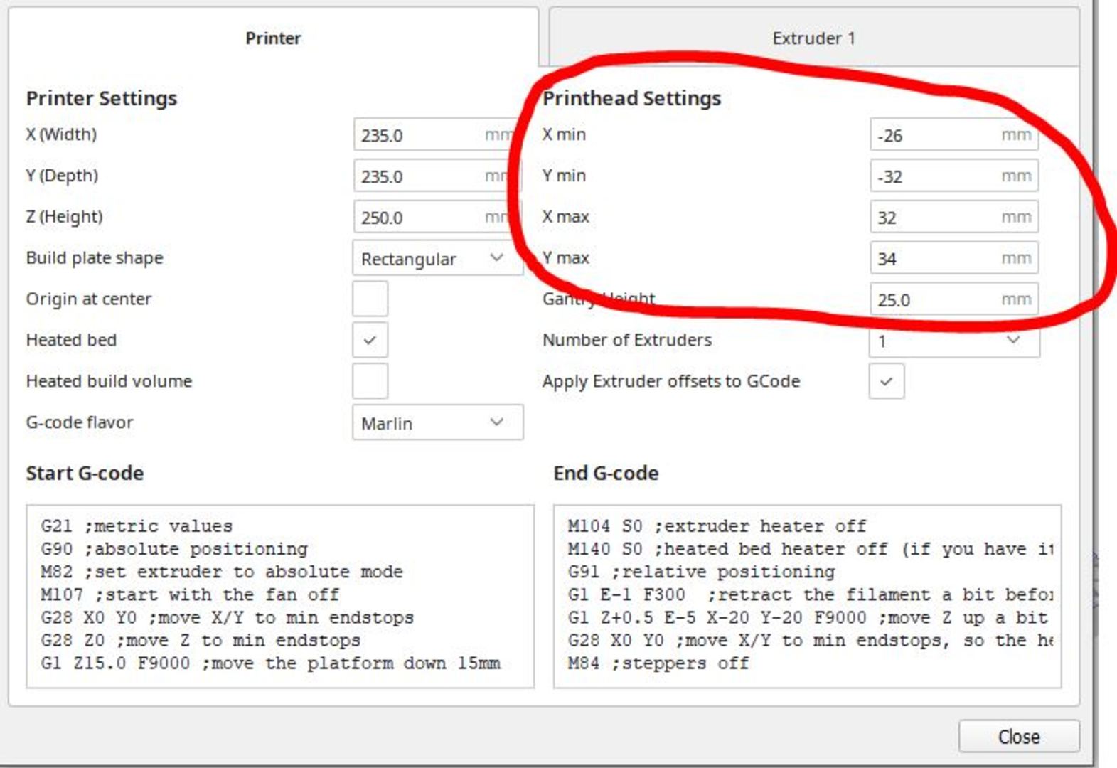 Nem tudom milyen szeletelőt használsz, a Cura-ban a "printhead settings"-ben tudod megadni a nyomtatófej geometriáját.