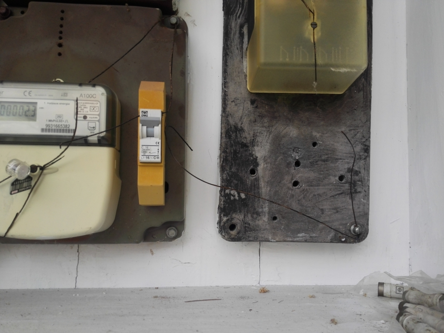 Tegnap láttam, amikor kinyitottam a mérőszekrény ajtóját,  -mert egy újonnan beszerelt konnektort,+ egy kapcsolót akartam bekötni, és áramtalanítani kellett- hogy a (műanyag) plomba zsinórok egy része szakadt.