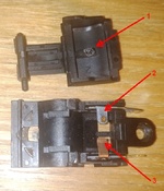 Az 1-es a hiba helye, ép állapotban itt van egy kiálló rész a műanyag alkatrészen, ez nyomja a 3-as érintkezőből hiányzó részt (az már a kezemben tört le) de idővel leolvad, és a látható csonk marad.