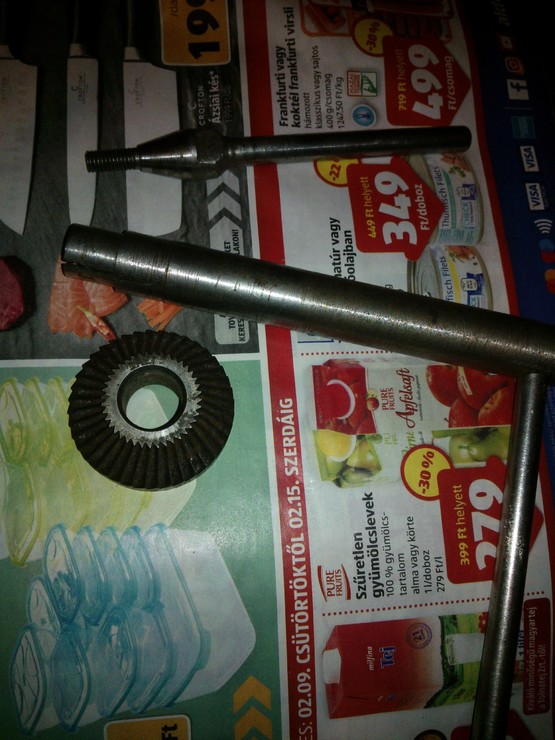 Tanulság: olyan tárcsa kellene aminek a fogai kicsit oldalra kiállnak, olaj nem jó kenésre, 50mm-en megfogva és 100mm-ert kilógatva a rúd felét telibe lehet vágni. (Végülis kapott egy 5-ös furatot végig.)