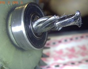 Esztergában a tengelyt hosszában megfúrod mélyen a csapágy alá, utána levágod a csapágy melletti ép résznél és megfordítva a furatba dugott tüskével visrosszagasztod. Nem a legkorrektebb megoldás de talán egy ideig működhet.