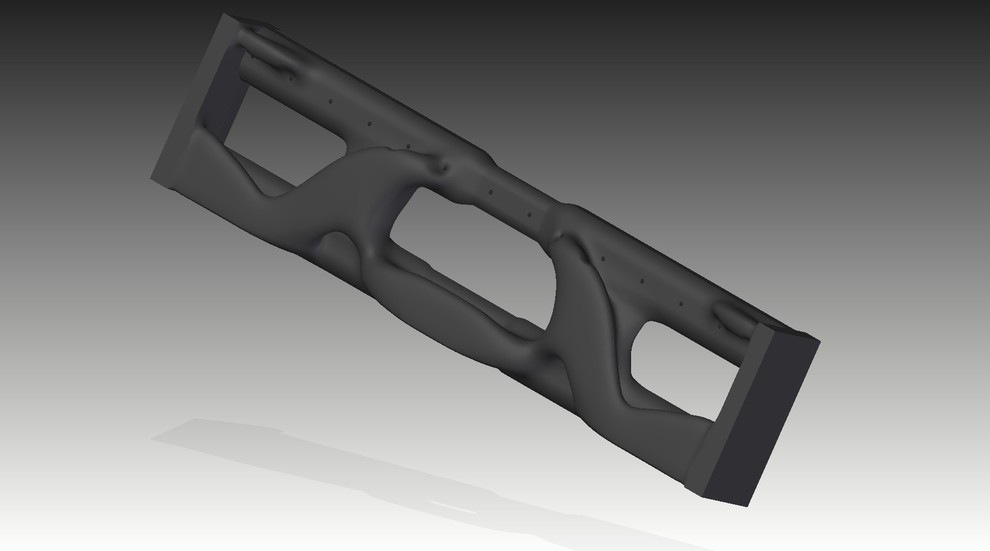 Csináltattam egy generatív tervezést a programmal. A kívánt cél a súly 75%-ra csökkentése volt, a hidat a két végén "rögzítettem", és 500-500N erővel nyomtam meg a síneknél, csak persze ellentétes irányban. Ez lett az eredmény: