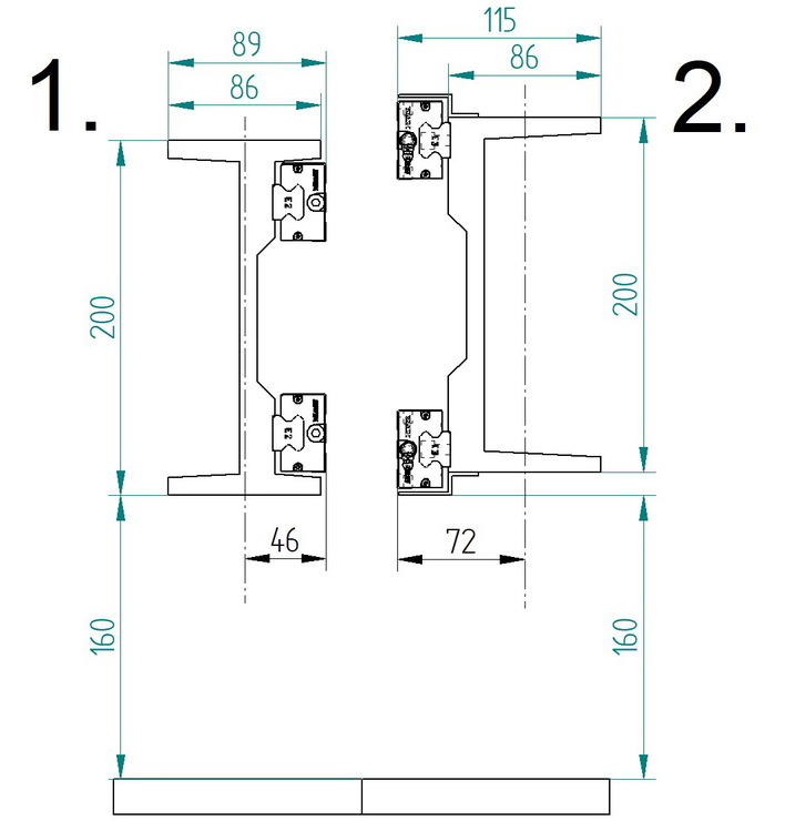 Az tiszta sor, hogy a síneket lehetőség szerint minél távolabb tegyük egymástól. De szerintem ez ugyan úgy igaz az alsó/felső vízszintes felületekre is, amik a csavarás ellen védenek. Ha megtartom ezeknek a 200mm-es távolságát, illetve a talpakat egyformán 86mm szélesre veszem, akkor így adja ki az egyik illetve a másik verzió. Jelenleg az 1.-est preferálom, az alábbiak figyelembevételével: