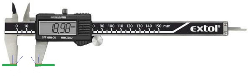 Én a tolómérő pofáit a piros vonalig visszaköszörülném, legyen felfekvő felület, két pofavastagságú, rozsdamentes tűgörgőt a kékkel jelölt helyeken AWI-val odapöttyintenék, aztán mehet a mérés.