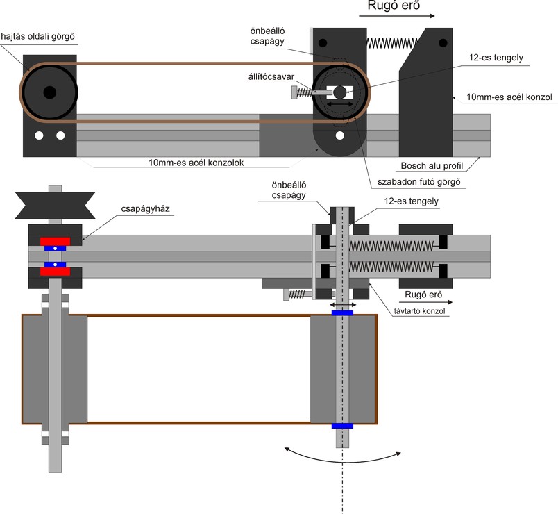A szabadonfutó görgő konzolját rugó húzza hátra felé, ezzel feszítve a szalagot. A szalag lefutását megakadályozandó teendő ugye a tengely szögének kis mértékű állítása. Ez az állítócsavarral történne. A tengely egyik pontja fixen egy önbeálló csapágyba van rögzítve, a másik vége viszont a konzolban lévő "nút"-ban el tud mozdulni az állítócsavar segítségével. Természetesen mindeközben a rugó folyamatosan húzza a konzolt, feszítve ezzel a szalagot.