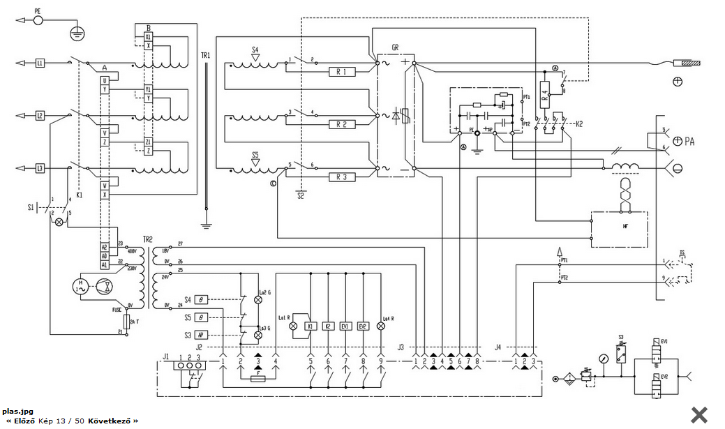 Sajnos még mindig nem értem mit ,hova , miért akarsz kötni .[#fejvakaras] Beteszek egy egyszerű klasszikus plazmavágó rajzot amin talán jobban követhető az áramkör .Ezen látható a pilot áram egy R4-es rezisztoron megyen keresztül amit a a K2-es mágneskapcsoló kapcsol egyszerre a HF-es gyújtással és utána a pilot vezetéken van egy becsatoló tekercs amin keresztül a HF rá van ültetve a pilotáramra majd a centrál csatlakozó 5-ös és 6-os kimenetére van kötve párhuzamosan ( PA). Ekkor ellenőrzésként leveszed a munkakábel centrál dugójának fedelét és leellenőrzöd , hogy az egy vagy két piros vastagabb vezetéke ugyanarra van-e kötve - ha nem akkor kiveszed és áthelyezed . A pilotáram tüskéi pár miliméterrel hosszabbak mint a kapcsoló szál tüskéi . Jelzem nem fontos 5-ös és a 6-oson lenni azaz lehet 6-7-en is csak mindig megegyezzen mert egy tüske terhelve akár beéghet - de lehet pótolni mert hegesztés technikai boltban külön is kapható még aranyozott kivitelben is  .Ezen a rajzon a kapcsolószál az 1-es és 9-es tüskére van kötve de természetesen ez is áthelyezhető arra amelyik jobban tetszik csak ugye megint természetesen az aljzatban és a dugóban is ugyanott kell lennie - mivel csak kapcsoló így tök mindegy a két kapcsolóér közül melyiket kötöd ( jelen esetben) az 1-esre és a 9-esre .
