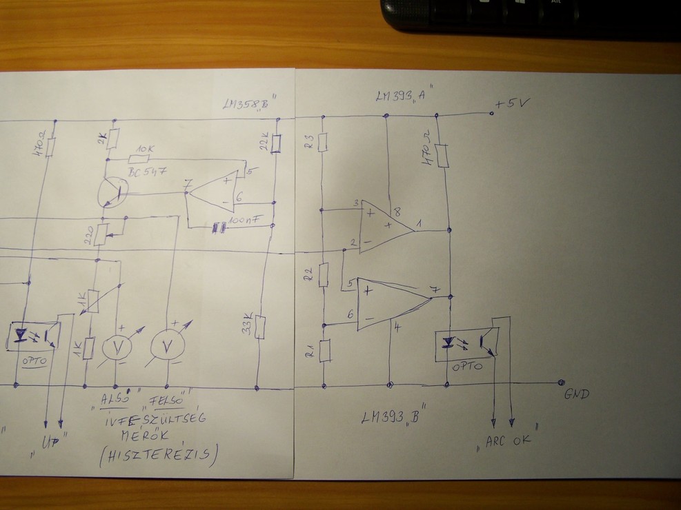 Volt már több próbálkozás a THC elkészítésre . Egy fórumtársunk , név szerint Hanks vállalta , hogy elkészíti a nyáktervet ill. készít egy teszt példányt is amelynek egyszerűbb rajzát már egyszer már közzétettem . Talán érdemes megint nekiugrani a témának de előtte közszemlére tenném a rajzot ill. nyugodtan nevezhetjük skiccnek , hogy páran átnézzék és az esetleges hibákat észrevételezzék . A rajz ugyan bonyolultnak tűnik de valójában elég egy kb. 60x70 mm-es nyáklemez . Ami nekem előnyösnek számít ennél a megoldásnál , hogy rendkívül olcsón megépíthető KIVÉTEL a 3 darab digitáli panelműszer amik árban húzósabbak voltak számomra . Viszont cserébe jól láthatóak messziről is a beállított értékek . Ugyanis az első műszer a bemenő fesz. osztón a plazma ívfeszültségét méri . A másik két panelműszer ( 2 V-os méréshatár elég ) a potméterekkel beállított referencia feszültséget és így vizuálisan látható a beállított DOWN illetve UP feszültség határérték vagy a kettő közötti különbség (hiszterézis feszültség) . Persze ez csak kis csalással lehetséges azaz pontosan úgy , hogy 2 V-os méréshatárral rendelkező műszernél a tizedes vesszőt két hellyel hátrább állítjuk .  Az "ARC OK" feszültség értékét még nem döntöttem el amit az R1-R2-R3 feszültségosztóval lehet beállítani .Talán a 70 V és a 170 V közötti érték a megfelelő ?[#nemtudom]De elsőre lássuk a skiccet és bár ez még nem a relés hanem az optocsatolós kivitel de ezt volt egyszerűbb lerajzolnom . Szóval várom az ötleteket , véleményeket , megoldás kritikákat - lehetőleg elektronika témában .