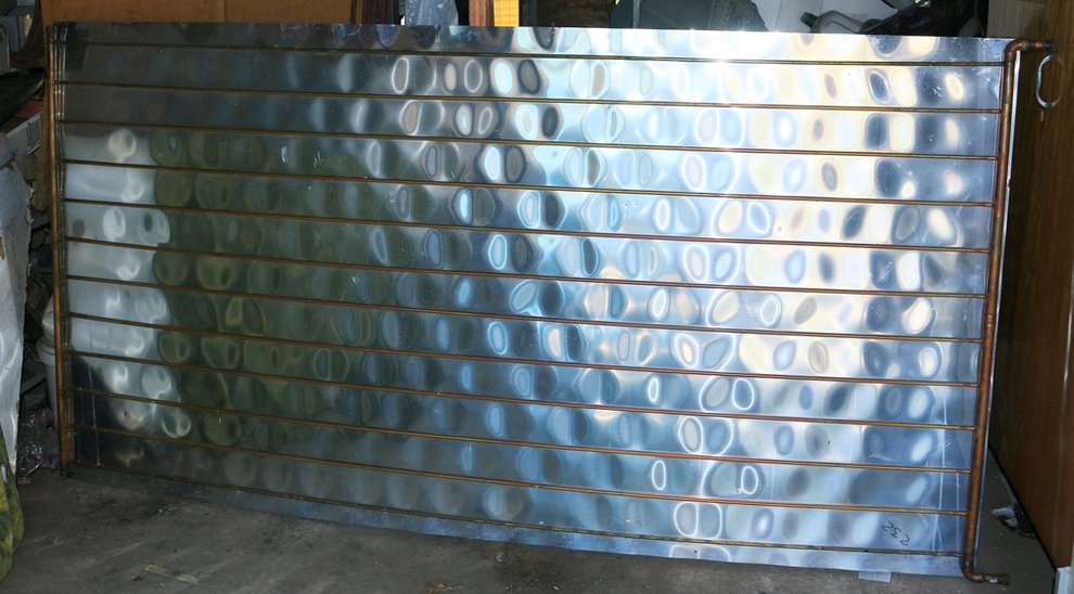 és a kollektor szélessége  is. Az egyik nagy ablakra árnyékot vetne a nyári melegben. A vizet mosógép szivattyú fogatná.Egy másik kollektor abszorberét felszereltem a lakókocsi mennyezetére, ebben keringene a meleg víz. Persze onnan még le kell csalogatni. Azért a mennyezetre mert nyáron a kútvizét keringetném benne. Kút klíma. Ha már fizetni kell érte akkor használjam is.