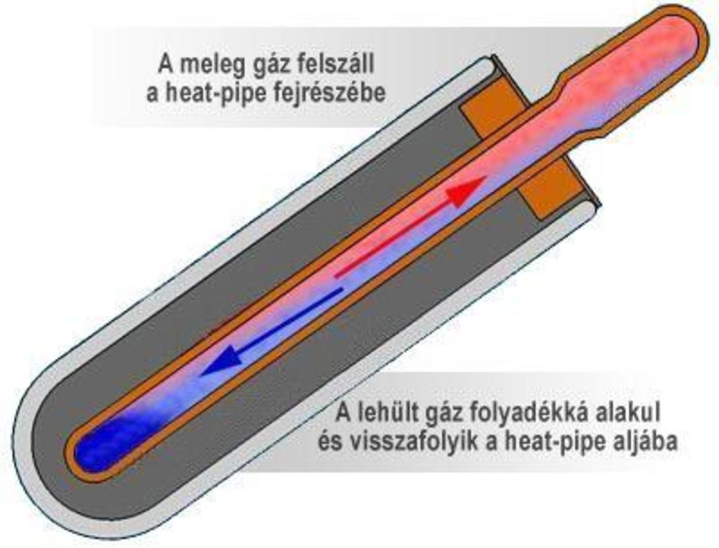 A vákuumcsöves napkollektor, mint ahogy a neve is mutatja a vákuum rendkívül jó hőszigetelési tulajdonságát hasznosítja, így szinte a külső hőmérséklettől függetlené válik a hőtermelés. A működési elve a jól ismert termoszéhoz hasonló. Egy dupla falú üvegcső két fallal határolt részéből kiszivattyúzzák a levegőt, ezzel biztosítva a szinte tökéletes hőszigetelést a cső belsejében. A dupla falú üvegcső anyaga bórszilikát, amely speciálisan ütésálló illetve a felületére érkező napsugárzást szinte tökéletesen átengedi. A dupla falú üvegcső belső felületére különlegesen nagy fényelnyelő képességű abszorpciós bevonatot gőzölnek fel, amely megközelítőleg a beérkező fénysugár 100%-át elnyeli. A vákuumcsövek feladata, hogy a belsejükben elhelyezett hő-termelő egységeket (heatpipe vagy U pipe) a környezeti hőmérséklettől függetlenítsék. Összefoglalva, a vákuumcsöves napkollektorok hatékonysága független a környezeti hőmérséklettől, csak a napsugárzás intenzitásától függ. Azaz téli hideg időszakban is lehetséges a hőtermelés! A heatpipe rendszerű napkollektorok A dupla falú üveg cső belsejébe szerelt hő-termelő egység a ,,Heatpipe" azaz hő-cső. A heatpipe belsejében egy speciálisan alacsony forráspontú folyadék található. Ez az alacsony hőmérsékleten párolgó töltet a hő hatására felforr, gőzzé változik és felszáll heatpipe felsőrészében találhat kondenzátor részbe. Ezt a kondenzátor részt nevezik hő-patronnak. A hőpatronba felszálló gőz felmelegíti a hőpatront kívülről körülvevő munkafolyadékot, majd a gőz ahogy átadta hőjét lecsapódik és visszafolyik a heatpipe alsó részében, ahol a hőhatására ismét gőzzé változik, felszáll és leadja hőjét, miközben ő maga kondenzáció során ismét folyadékká változik. Ezzel a körfolyamattal tudjuk a hőpatront kívülről körülvevő munkafolyadékot felmelegíteni.
