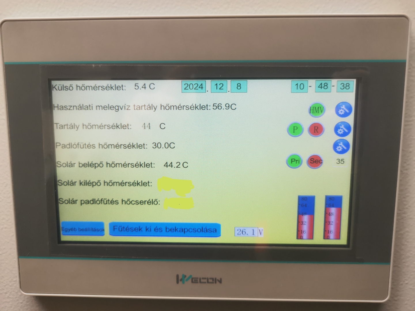 80db vákuumcső van fent. 750L fűtés és benne 200L HMV. De mindegyikben külön hőcserélő is van. Ha kevés a "NAP" és csak 35 fokos vizet csinál azt is hasznosítom egy lemezes hőcserélőn keresztül küldöm a padlófűtésbe. Persze, ha süt a nap szépen akkor megtermeli a napi fűtést és a HMV-t is. Olykor marad másnap is. Mindenhol padlófűtés van. 28-30fokos előremenő vízzel. Ezt egy keverőszelep állítja be (PLC vezérli) ellőtte meg van egy kiválasztó szelep, hogy tartályról vagy a solár/lemezes hőcserélőről. Egyszerűen mint a faék.
