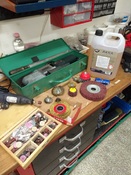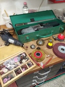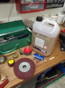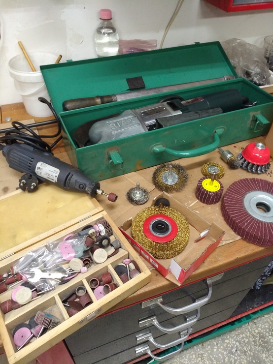 Ezután vizzel lemosom , és azonnal levegővel megszárítom. Ha marad egy-két fátyol rozsda nem probléma, mert utána , a képen látható drótkefékkel a nútot , majd az asztalnak minden részét átdolgozom. Ha kész , akkor ipari acetonnal átmosom, majd