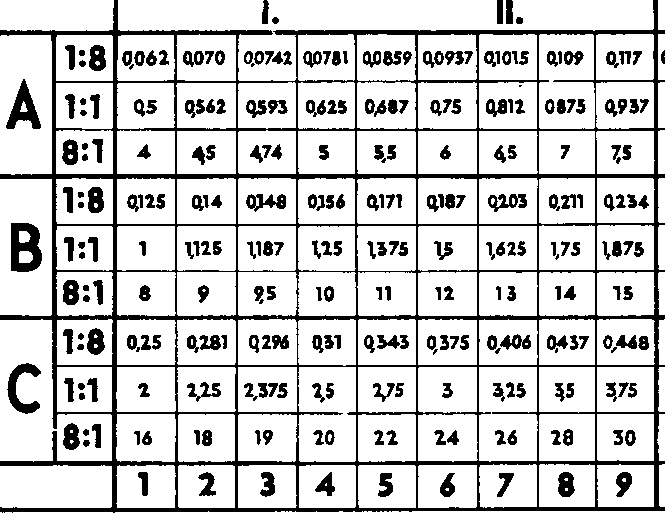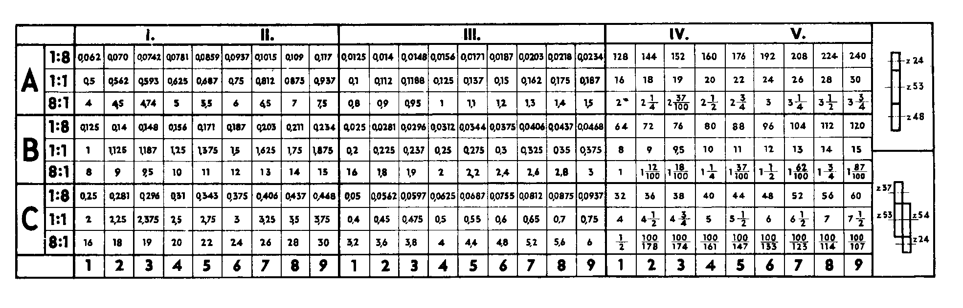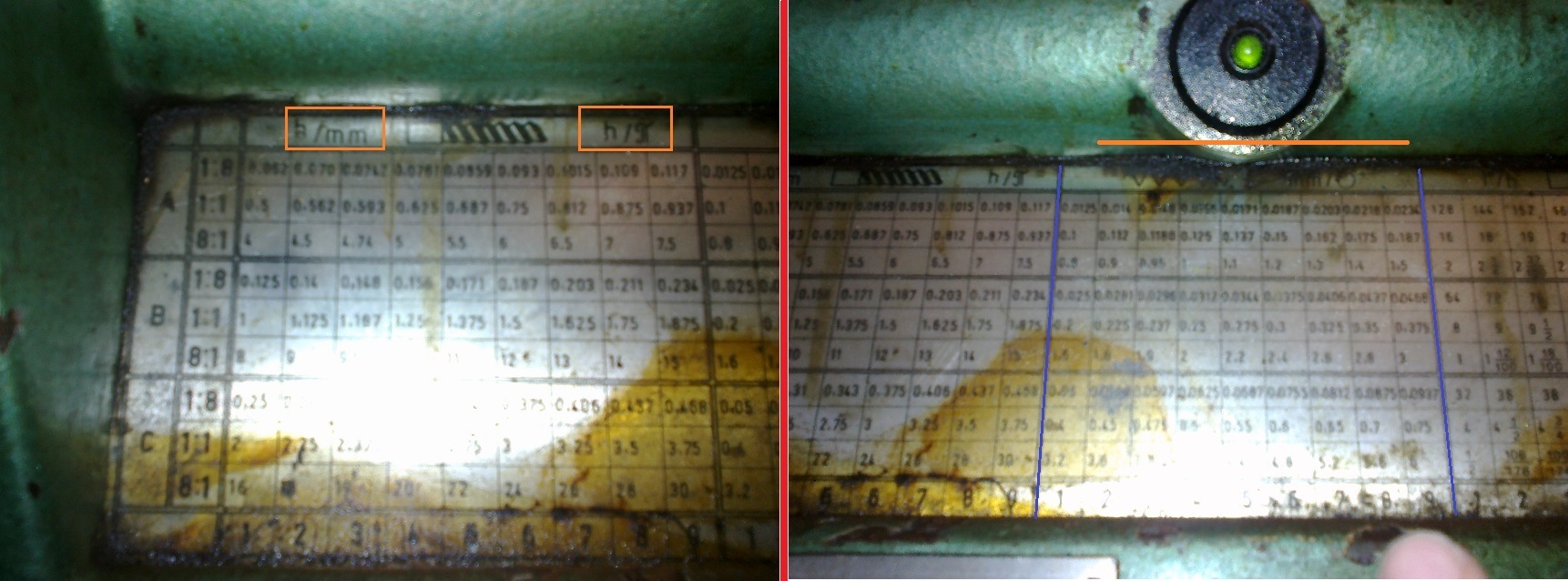 Az tábla három részre van osztva, balra (gondolom én) a metrikus előtolás, középen nem tudom mi, jobbra a colos. (a colost nem fotóztam).