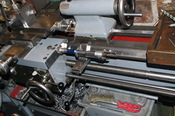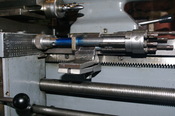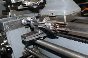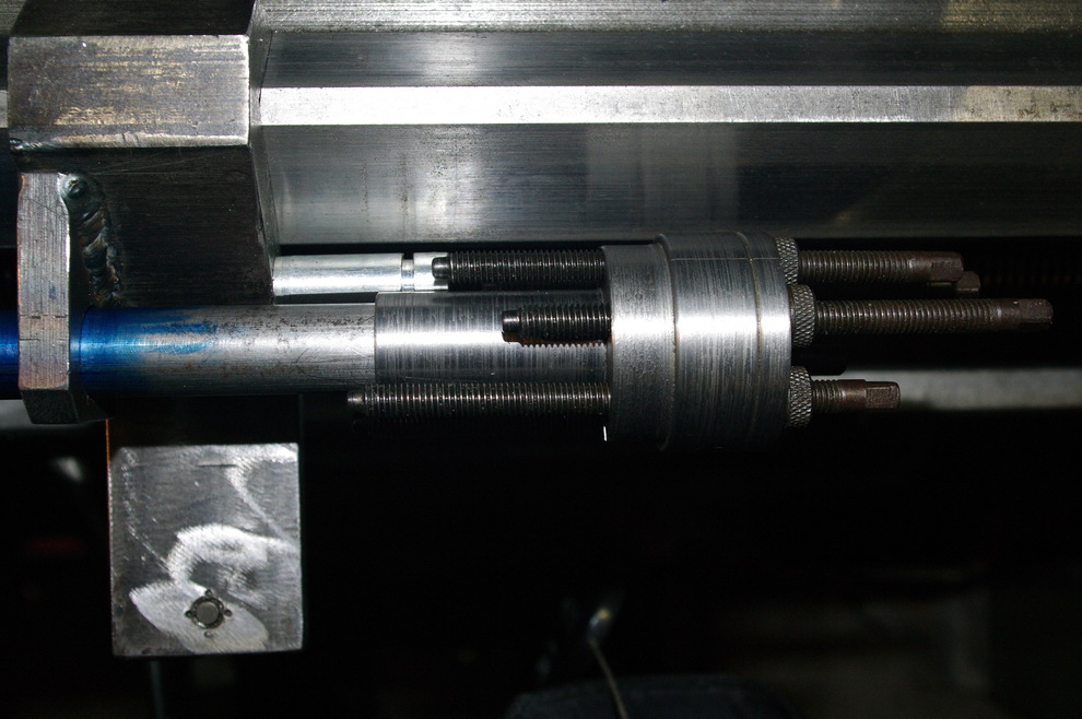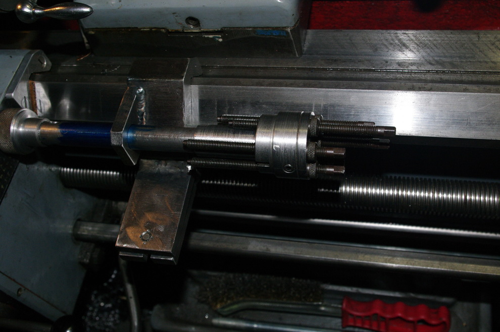 A szánt levéve fúrtam egy M8 menetet amibe tőcsavar került. Arra tekerhető fel a az ütköző rúdja. A rúd végén egy revolver rendszerű dob van amit egy rugó által nyomott golyó rögzít hatvan fokonként. A csavarok egy gyári szerkezetből származnak. Az ütköző tömbje egy átalakított gyári ütköző. A szerkezet előnye hogy hátul forgácstól védett helyen van. Kevésbé merev ütközést ad mit a szán előtti kivitel, de így is 3..4 századon belül van a méret.