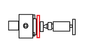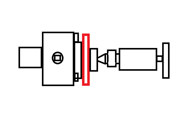 Nagyobb átmérőjű rövid hengereket, korongokat (pl. d200x20mm) ő úgy szokta átmérőzni, hogy tesz a fordított pofába egy pl. d130-as sík anyagot, ami csak annyira vastag, hogy picit kilóg. Erre ráhelyezi a munkadarabot, addig tartja kézzel, és elővesz egy harmadik mégkisebb korongot, aminek a közepében szegnyeregcsúcsnak megfelelő kialakítás van belefúrva. A szegnyereggel és forgócsúccsal ezt a "szendvicset" összenyomja. Rajz lent, a piros a munkadarab.