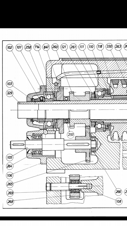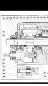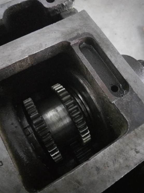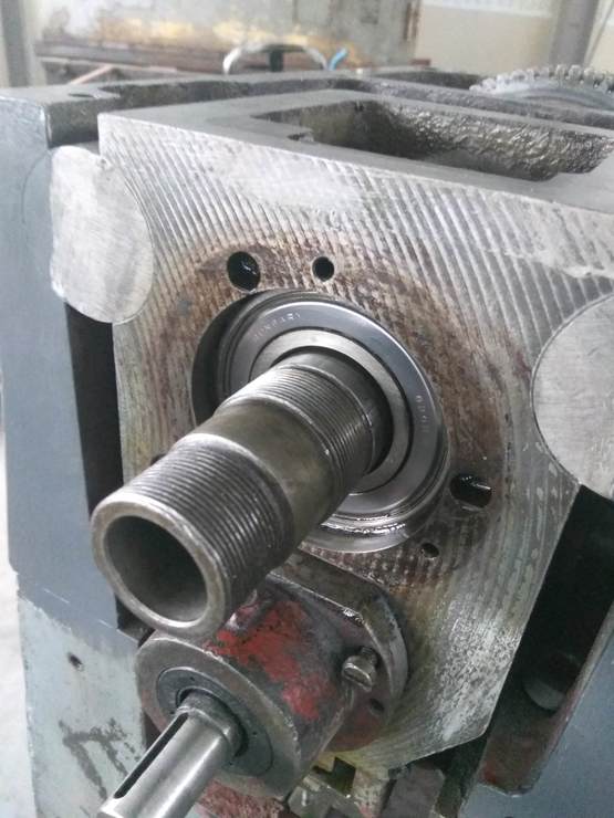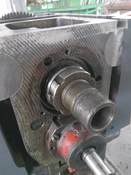 A főorsó hátulján még egy támcsapágy van beépítve. Ami a képen látható nagy fém porvédős golyóscsapágy, annak eredetileg szinelnie kelene az öntvény házzal, és rögtön rászorul a záróanya. Nekem a golyóscsapágy beljebb van tolva, és be van építve még egy támcsapágy, de emiatt a golyós a saját beépített kenőanyagával üzemel, eltakarja az olaj bevezető nyílást.