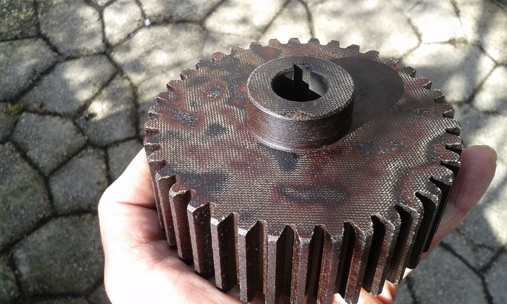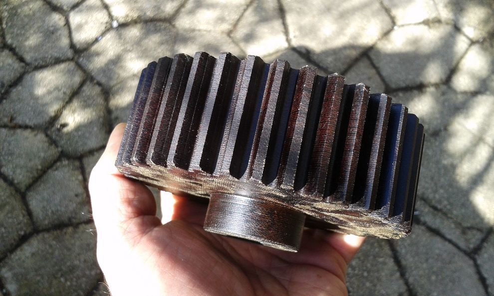 3,6kW-os, négypólusú motor tengelyére húzva hajt sok-sok éve, egy kb. 900-1000 mm átmérőjű acél fogaskoszorút, szárazon.