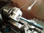 Íme a feladat. Ez a hengertest már kész van, de kb látni a lényeget. A felfogás tőcsavarokkal, azt a tárcsát szorítom. A hengertestek 70-90mm közötti magasságúak, belül nyílásokkal. (Itt ép a frissen elkészült 1.0-ás késtartó, a nyers késsel. Ja, azért ilyen nagy hogy ne sípoljon...)