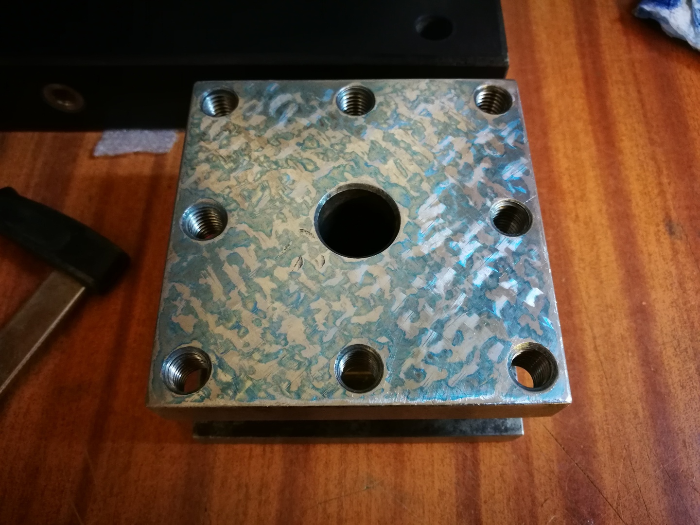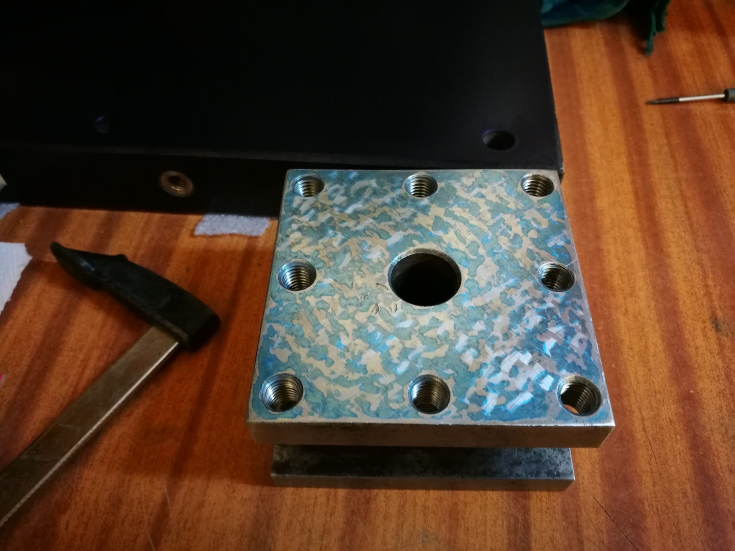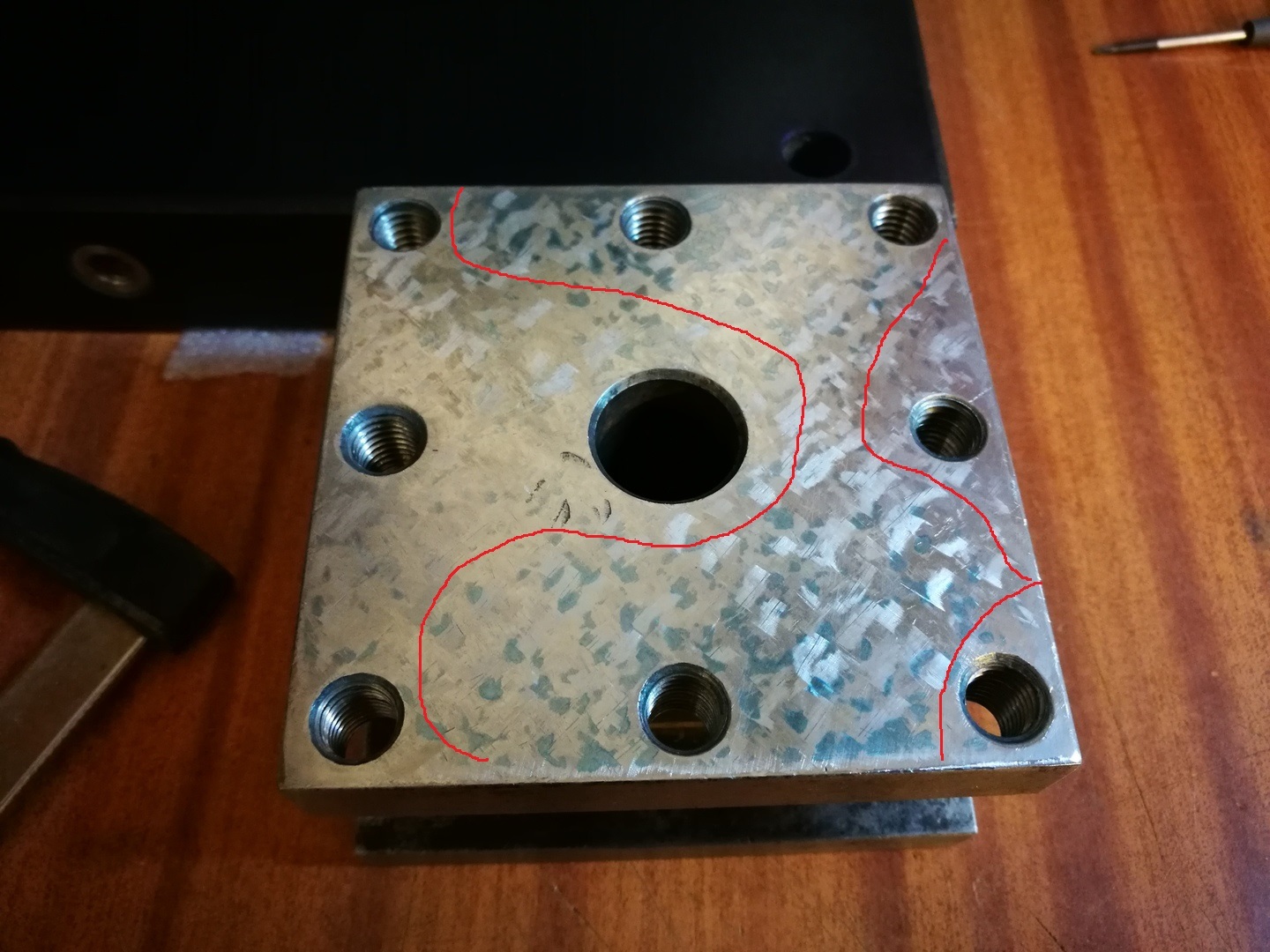 Köszi a képeket, így már mindjárt érthetőbb a probléma. Az első képen a késtartón látszik, hogy túl vastag a grániton a festék. Ezt angolul úgy mondják, hogy "smear", elmosódás, elkenődés. Ekkora festékvastagságot, csak nagyon durva nagyolásnál szoktak használni, de talán ott se. A második képen is túl sok a festék, viszont van egy jó példa a nagyon magas pontokra a jobb alsó két menetes furat között. Látod a két megszürkült tetejű pontot? Az a kettő annyira magas, hogy a gránit ledörzsölte róla a festéket.