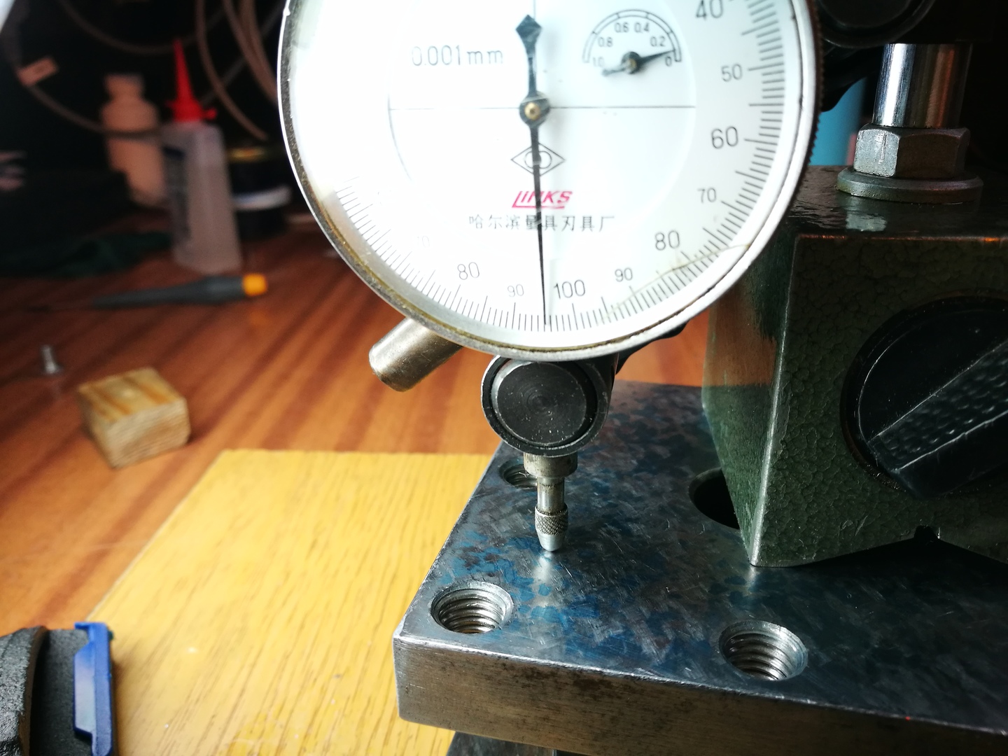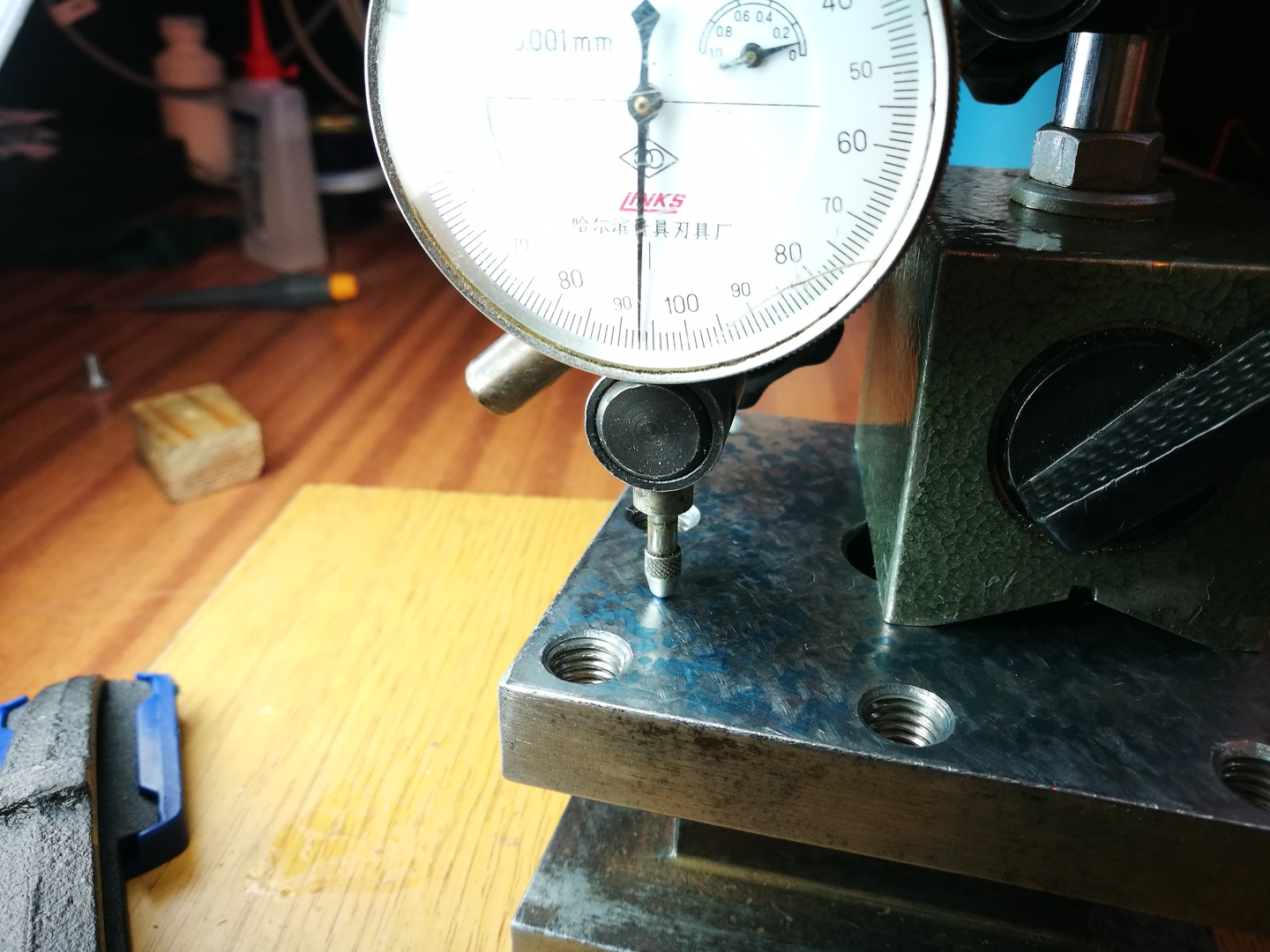 Aztán mértem az órával (bár elég nagy a mágnestalp a felülethez képest), 2 ezred a talált legmélyebb gödör. Továbbá 2-3 ezredet mértem a sarkokban lévő magas pöttyök között (kvázi síklapúsági hiba?).
