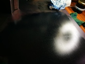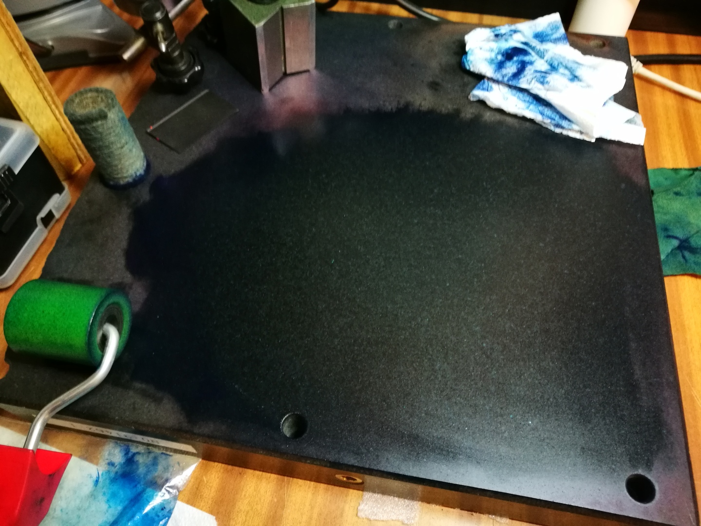 Próbáltam lefotózni a festéket is, az lámpával bevilágítottnál látszik hogy vastag a festék, ott csíkosra keni a henger. Ezt áttörölgettem papírtörlővel (figyelve hogy egyenletes legyen és ne maradjon piszok utána), elég sok lejött. Ezzel festettem az első képet.