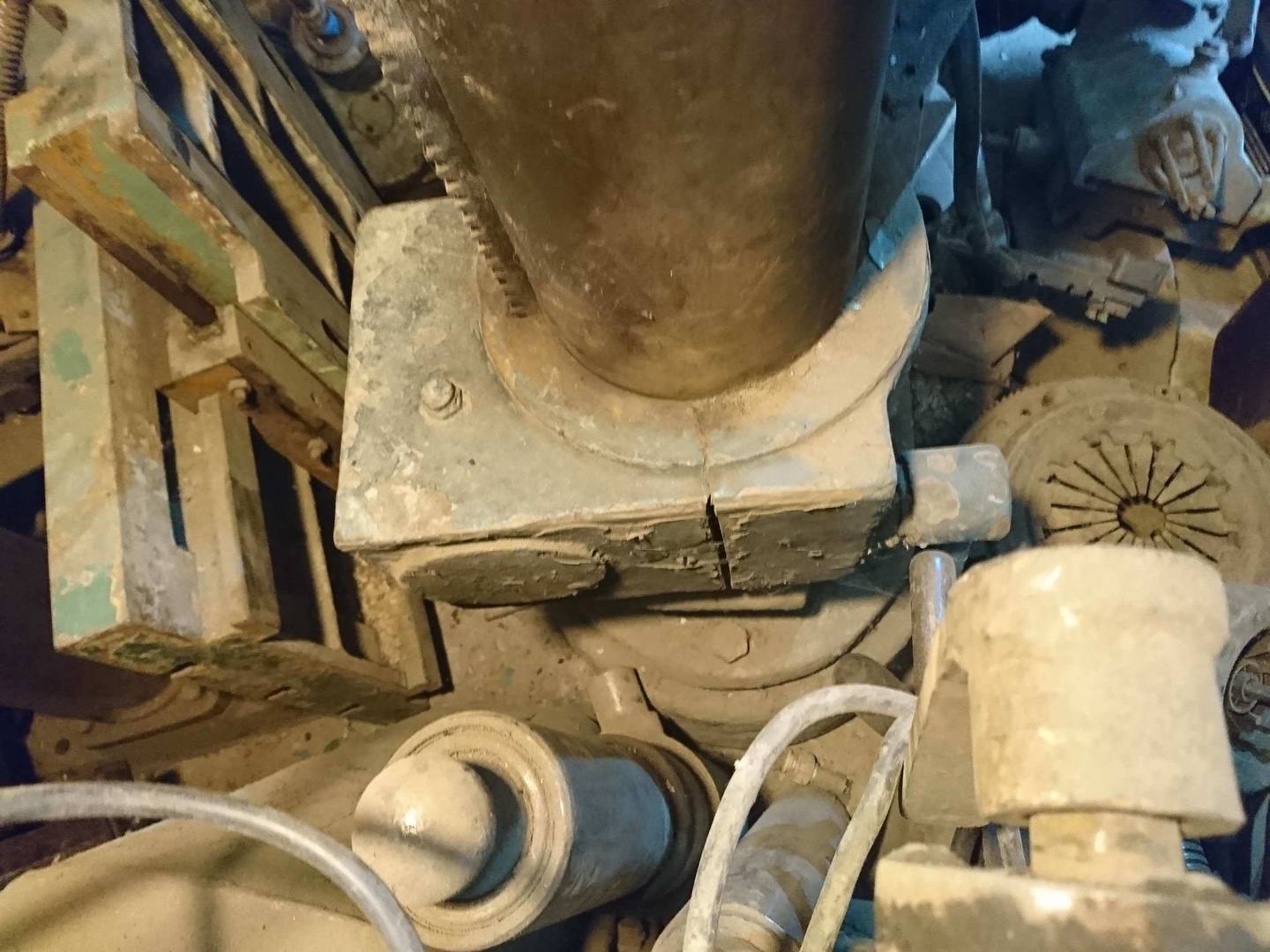 Az öntvények furataiban a tengelyeket kúpos csapszegek rögzítik. Azokat nem mindegy, hogy melyik végéről próbálom kiütni. Tévedni meg nem lehet. Összerakásnál sem. Ráadásul nem is pontosan a tengely középvonalán halad keresztül, ezért a tengely pozíciója sem mindegy. Tökölni kellett vele mire visszastimmelt a helyére.