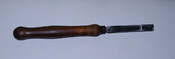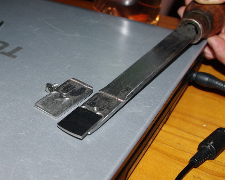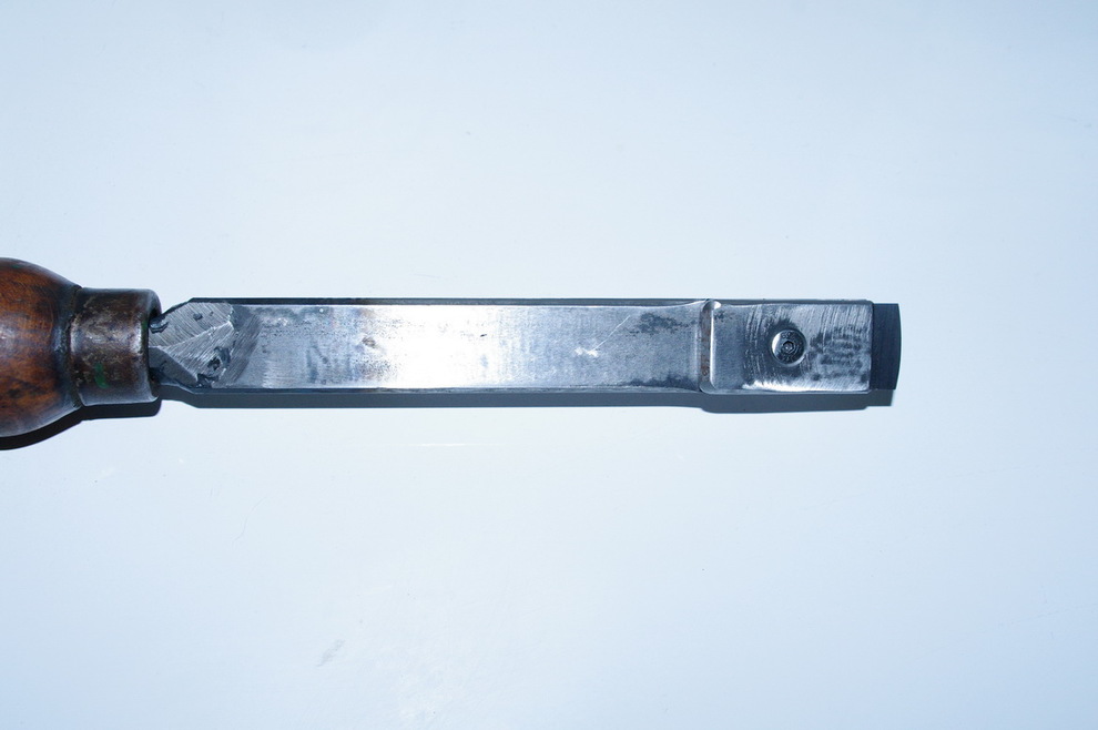 Ahogy én szoktam hántolni úgy nem kell rugalmas szár a hántolóhoz. ( bár úgy is ki kellene próbálnom ) szóval nekem sima laposvas az anyag, és egy régi szerszámnyél a fa rész. Lapkának egy gyári hántolólapka van befogva. Ilyen beszerzését a drágasága ellenére is ajánlom mert tényleg ég és föld a lapka használhatósága éltartóssága bármi máshoz még az egyéb vídia darabokhoz képest is. Mellékesen azóta is keresek egy két elfekvő hántoló lapkát megvételre, de eredménytelenül.