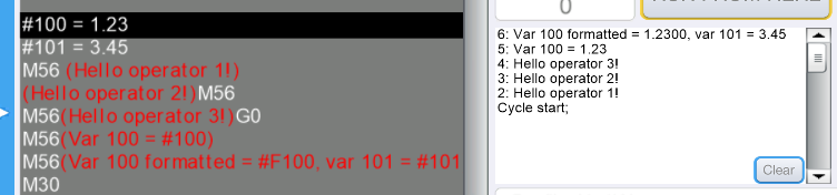 Összeraktam egy makrót, amivel kód futása közben a státusz ablakba lehet kiíratni információt. A makró az M56 sorszámot kapta, mert ez hasonlít legjobban az MSG (message, üzenet) alakjához. Amelyik sorban az M56 szerepel, abból a sorból a zárójelben levő (tehát megjegyzés) szöveget írja ki. A szövegben található #nnn és #Fnnn részeket, ahol nnn egy változó sorszáma, kicseréli a változó értékére. A #nnn csak simán, a #Fnnn négy tizedesjeggyel formázva írja ki az adott változó értékét. A csatolt képernyőmetszeten jobban látszik, mint ahogy leírom. :) Legalább az 1.2102-es verzió kell ahhoz, hogy működjön!
