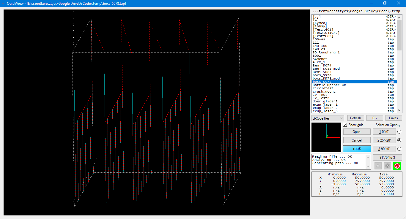 A képen a bal oldali a teszt, az alsó soron kétszer ment végig, majd a jobb oldali deszkán az éles, változatlan G kóddal, ami az alábbi: