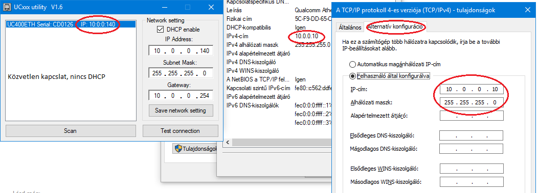2. Közvetlenül kötöd össze a gépet az UC400-zal, a gépet csak erre használod. Ilyenkor beállítasz a gépnek és az UC400-nak egy-egy fix IP címet, pl. UC400-nak 10.10.10.11 (DHCP pipát kiveszed), a gépnek 10.10.10.10, mindkettőnél a maszk 255.255.255.0. Mivel csak egymással fognak beszélgetni, az átjáró nem érdekes.