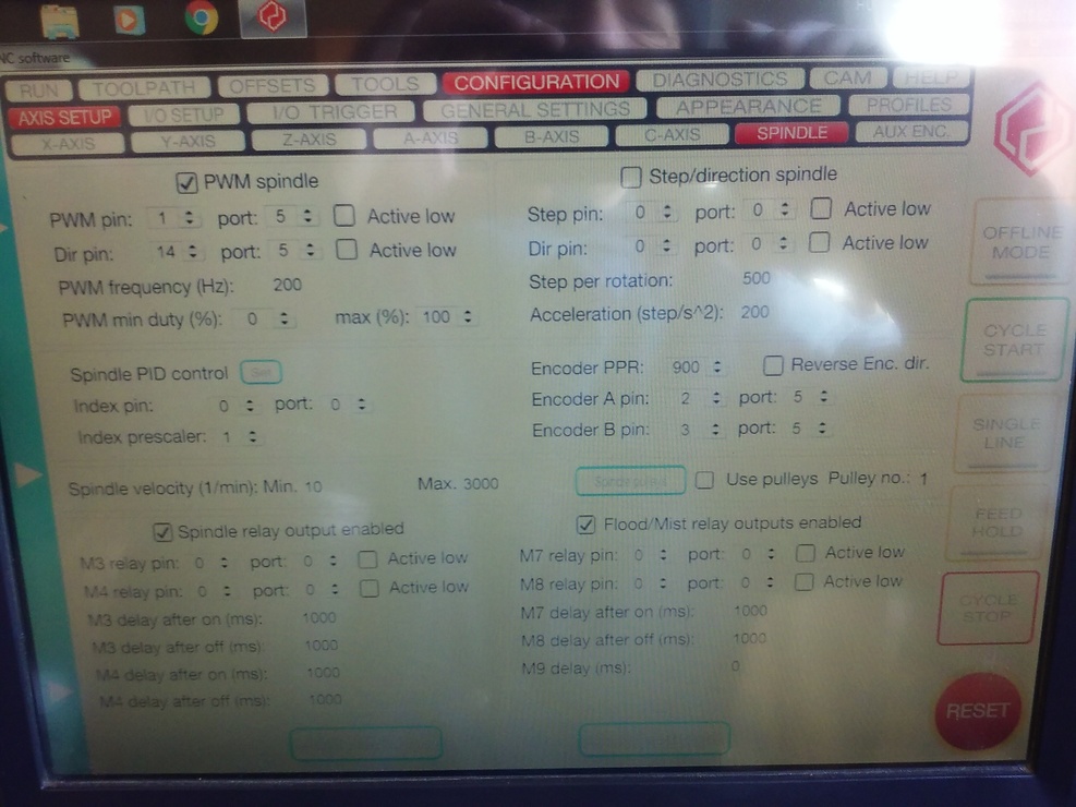 Régóta küzdök azzal, hogy a program az aktuális főorsó fordulatszámot jelezze, ill, hogy tudjam használni a főorsó PWM szabályzást a programból.Egyenlőre még nem működik.