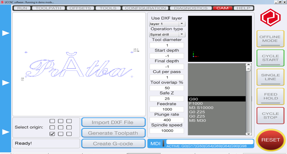 Az UCCNC licenszelve van azon a gépen is, amit tervezésre használok, nincs a marógépre kötve. A lakásban van a kényelmes, tiszta körülmények miatt. Viszont kapcsolat nélkül ugye csak demo módban indul el. Így viszont a Cam-ja által generált G kód limitje 250 mondat (sor). Ezen talán érdemes lenne módosítani, azaz jó lenne, ha a licenszelt verzió demo módja nem hivatkozna arra, hogy nincs licenszelve, és akár a rákötött "munkagépet" sem kellene túráztatni feleslegesen a tervezéskor, offline próbálgatáskor.
