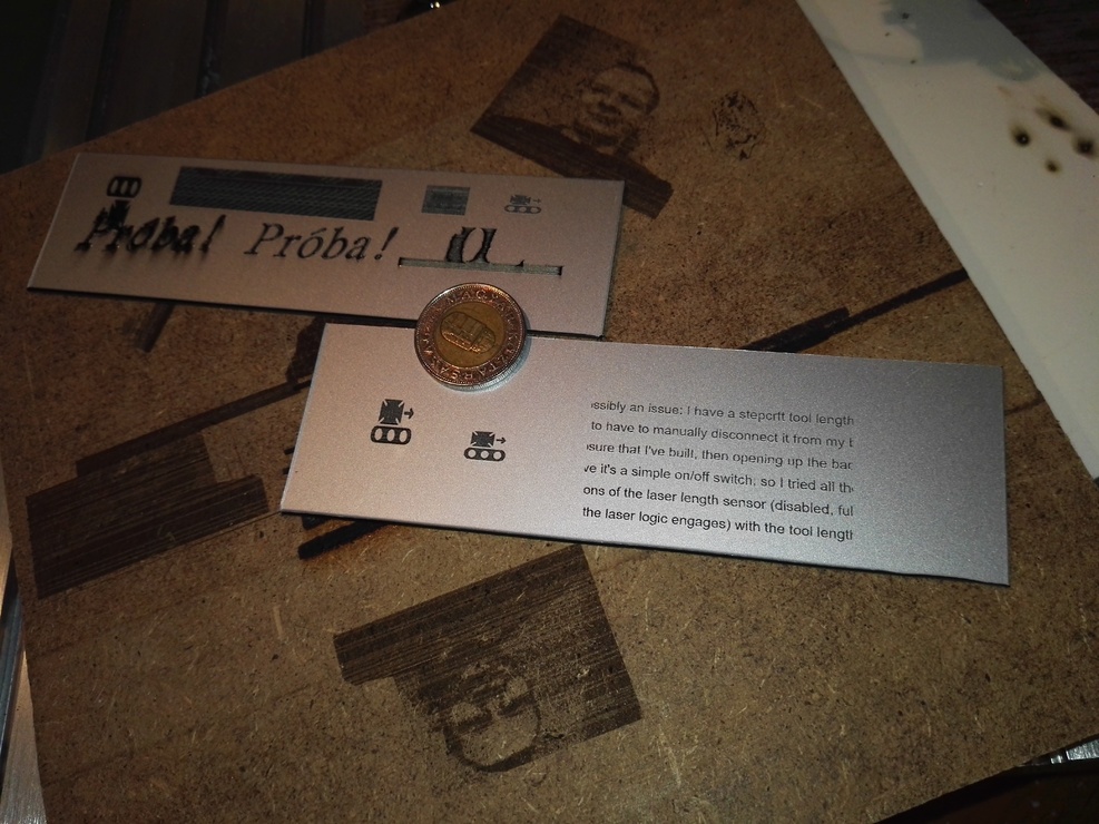 A nagy betűs Próba felirat az Aspire progival készült, és ahogy leírtam, úgy szerkesztettem át a G -kódot hogy ne égesse túl a lapot. A többi az UCCNC -ben lévő plugin -al készült. Azt a több soros apró betűs szöveget kép ként mentettem el, és úgy importáltam a plugin -ba. A tapasztalatom az, hogy sokkal szebb a minta, ha folyamatosan pásztázza sorrol sorra a felületet a lézer, és csak ott kapcsol be ahol kell. Aspire -ből generált kódnál sokszor megáll a lézer bizonyos pontokon, és emiatt ott jobban megégeti a felületet. Tehát nem egyenletes a gravírozás.