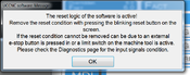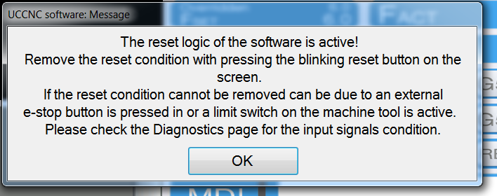Reset állapotban ha megnyomják pl a cycle start gombot vagy bármi más gombot, megjelenik az üzenet. A vészkapcsoló (hardware) visszaállítása után egy makroloop nyugtázza a Reset állapotot. A gép el is indul, működik utána. Monitor nélkül nem látják, hogy valamire kattintani kellene és az üzenet ott marad. Hibát nem okozott tesztelésnél de nem tudom az UC t nem zavarja e a működésben.