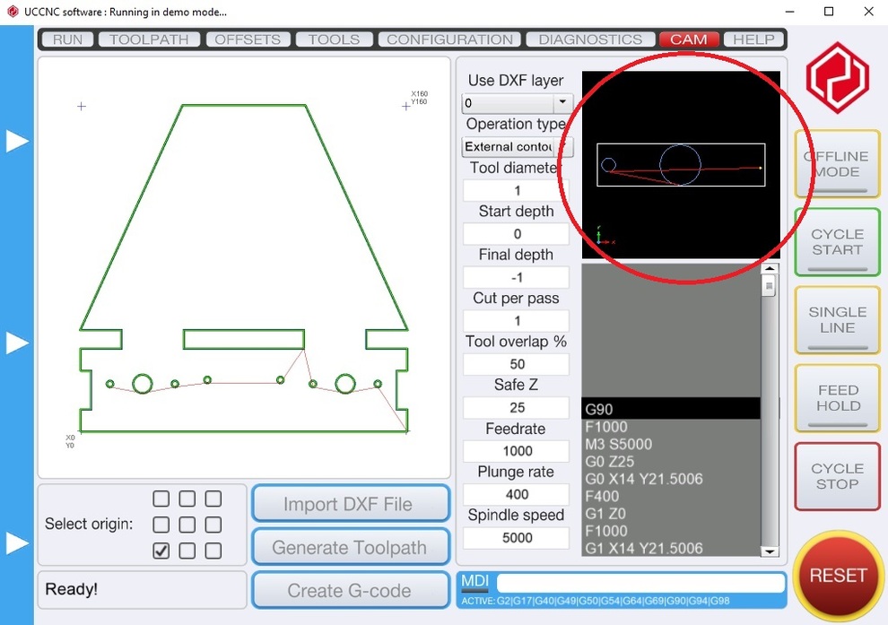 A CAM rész működik rendesen, vagy csak nálam nem hajlandó? Miután betöltöttem egy végtelen egyszerű DXF-et és legeneráltam a G-kódot kicsit érdekes alak jött ki belőle. Nem egyszer próbáltam meg, és az eredemény minden esetben eltérő az eredeti rajztól.