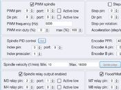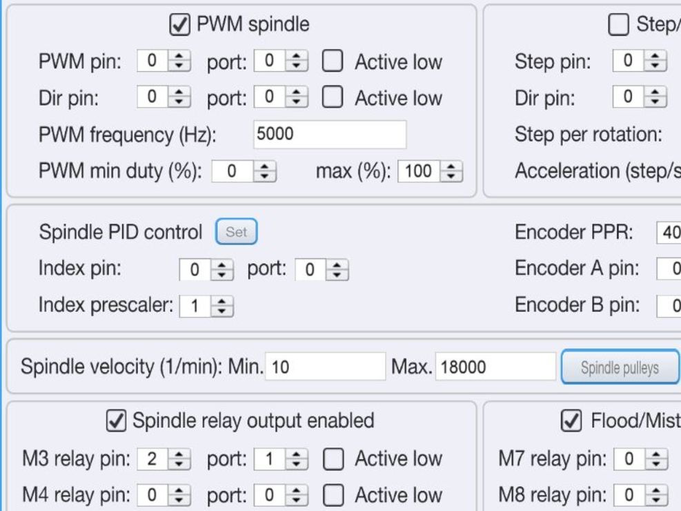 Állítsd be a konfigurációban a spindle oldalon a spindle speed, vagyis a főorsó sebességtartományát és a kimeneti PWM min. és max. kitöltési tényezőjét. Ez utóbbi fogja adni az analog kimeneti feszültség min. és max. értékeit. 0-100% esetén 0-10Volt feszültségtartományt.