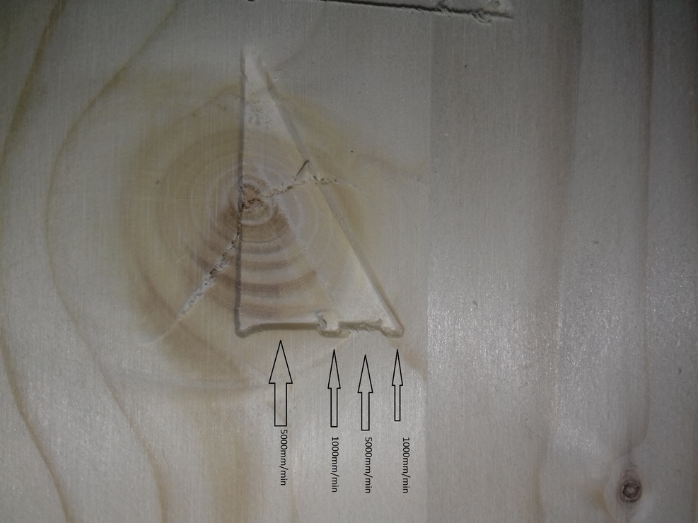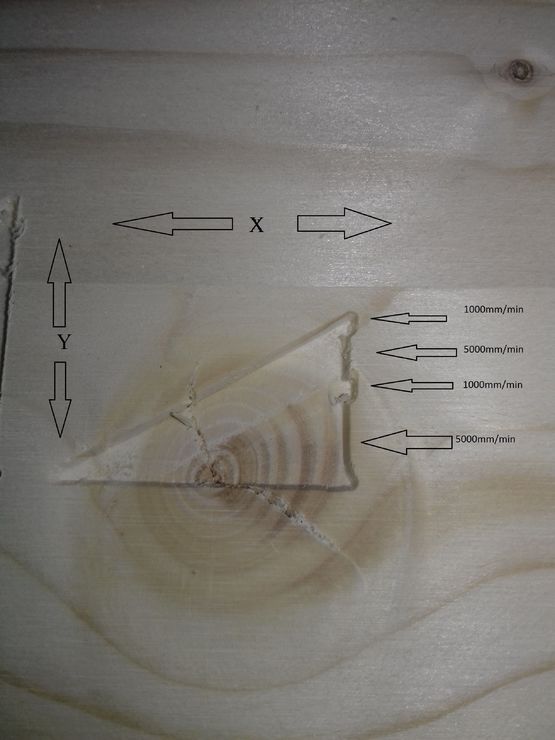 Az alábbi marást végeztem. 30fok raszterban marva sarokból indulva 5000mm/min indulás majd ahigy a képen látszik az előtolás váltakoztatva lett. Az eredmény látszik.