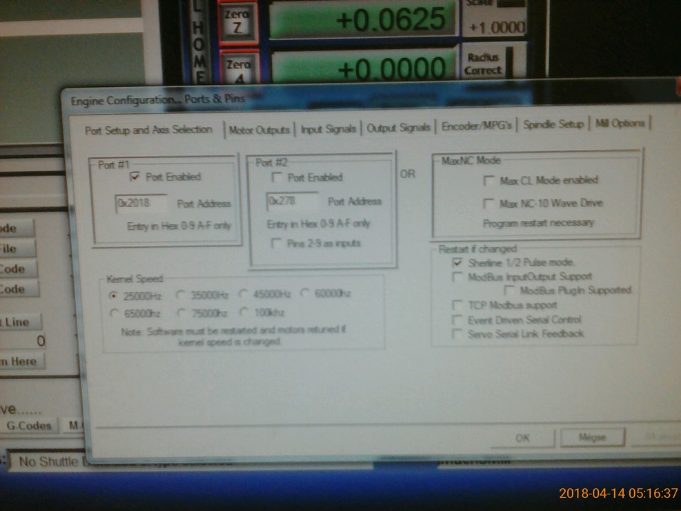 A tengelyeket sikerült konfigurálni, vizont az INPUT/OUTPUT nem akar működni. 5V Relé vezérelt Spindle-t szerenék hajtani, de az istenért sem találom a helyes beállyítást.